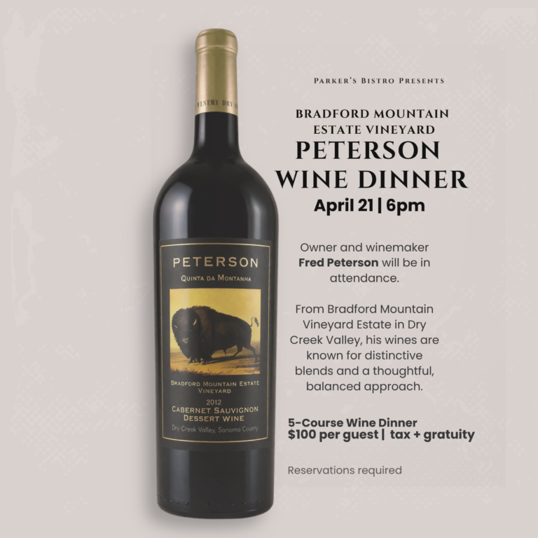 A five-course wine pairing dinner featuring wines from Bradford Mountain Estate Vineyard in Dry Creek Valley, part of Peterson Winery, a family-owned Sonoma producer known for small-lot wines crafted with a thoughtful, balanced approach.