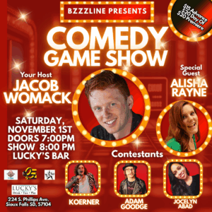 On Saturday, November 1, Sioux Falls Stage Award winning comedian Jacob Womack joins special guest Alisha Rayne and Stage Award nominees Koerner, Adam Goodge, and Jocelyn Abad in a Jackbox Party Pack showdown.