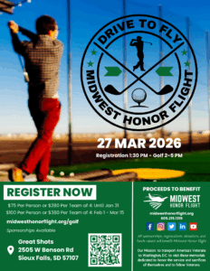 Join friends, colleagues, and fellow golf enthusiasts for an unforgettable afternoon of fun, food, and friendly competition at Great Shots. Whether you’re a seasoned golfer or a beginner, this event offers something for everyone! Mark your calendar for March 27, 2026 and get ready to Drive to Fly! All sponsorships, registrations, donations, and funds raised will benefit future Missions for WWII, Korean, and Vietnam Veterans through Midwest Honor Flight. Our Mission: to transport America’s Veterans to Washington, D.C. to visit those memorials dedicated to honor the service and sacrifices of themselves and to fellow Veterans.