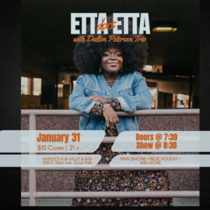 A soulful night of live music with Etta McKinley, a Sioux Falls favorite known for her powerful vocals and commanding stage presence. Etta Does Etta celebrates the timeless sound of icons like Nina Simone, Billie Holiday, and more – blending jazz, blues, and soul with Etta’s unmistakable passion and style, backed by the Dalton Petersen Trio.