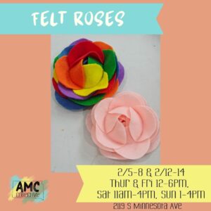 Guests will create roses using felt circles and can decide how they want to finish them. The rose can be attached to a stick for a stemmed flower, turned into a magnet, or left as-is to sit on a shelf. Each one is unique and made to fit whatever feels right for the maker.