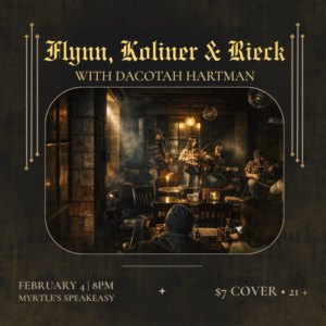 Myrtle’s Speakeasy will host an intimate evening of live music on Wednesday, February 4 at 8pm, featuring Kevin Koliner, Colin Flynn, and Josh Rieck, with special guest Dacotah Hartman.