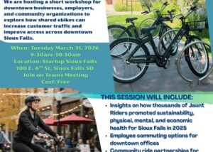 As a first-of-its-kind community mobility system, Jaunt continues to pioneer local economic connectivity. We are hosting a short workshop for downtown businesses, employers, and community organizations to explore how shared ebikes can increase customer traffic and improve access across downtown Sioux Falls.