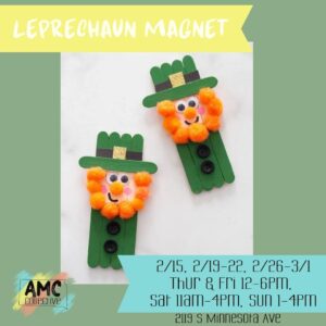 Leprechaun Magnet is a drop-in craft where guests will use popsicle sticks, paint, and pom poms to create a cute little leprechaun, finished with a magnet on the back. It’s playful, hands-on, and perfect for younger makers or anyone who loves a quick, cheerful project.