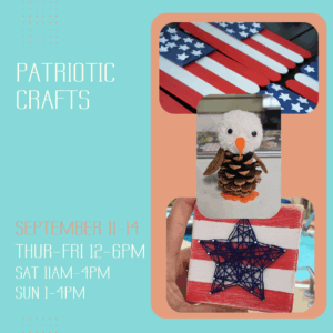 In honor of September 11, join us for a weekend of patriotic crafting. Choose from three featured projects: Patriotic String Art, Popsicle Stick Flags (punch card eligible), and Pinecone Eagles (punch card eligible). Let’s create together and Never Forget.