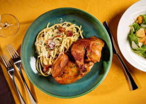 September’s featured menu item is Chicken Carbonara: Brined, marinated and roasted half chicken, angel hair pasta, butter, garlic, Parmesan, black pepper, bacon, egg yolk, chive and lemon.