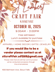 The St. Lambert Craft Fair is a one day event full of local crafters – come shop the many vendors to find homemade goods, jewelry, and a variety of other crafts. The craft fair will take place on Saturday, October 18th from 9:00 a.m. to 3:00 p.m. at the church, 1000 S. Bahnson Avenue in Sioux Falls. FREE admission. Lunch and baked goods available for purchase all day. Come and make memories to last a lifetime!