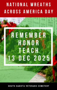 Join us this December out at the South Dakota Veterans Cemetery as we lay remembrance wreaths to Remember, Honor, and Teach. Following a short ceremony at 11:00 AM sharp, wreaths will be placed throughout the cemetery on the final resting place of the Veterans interred there. Sponsorships can be given online: www.wreathsacrossamerica.org/SD0021P