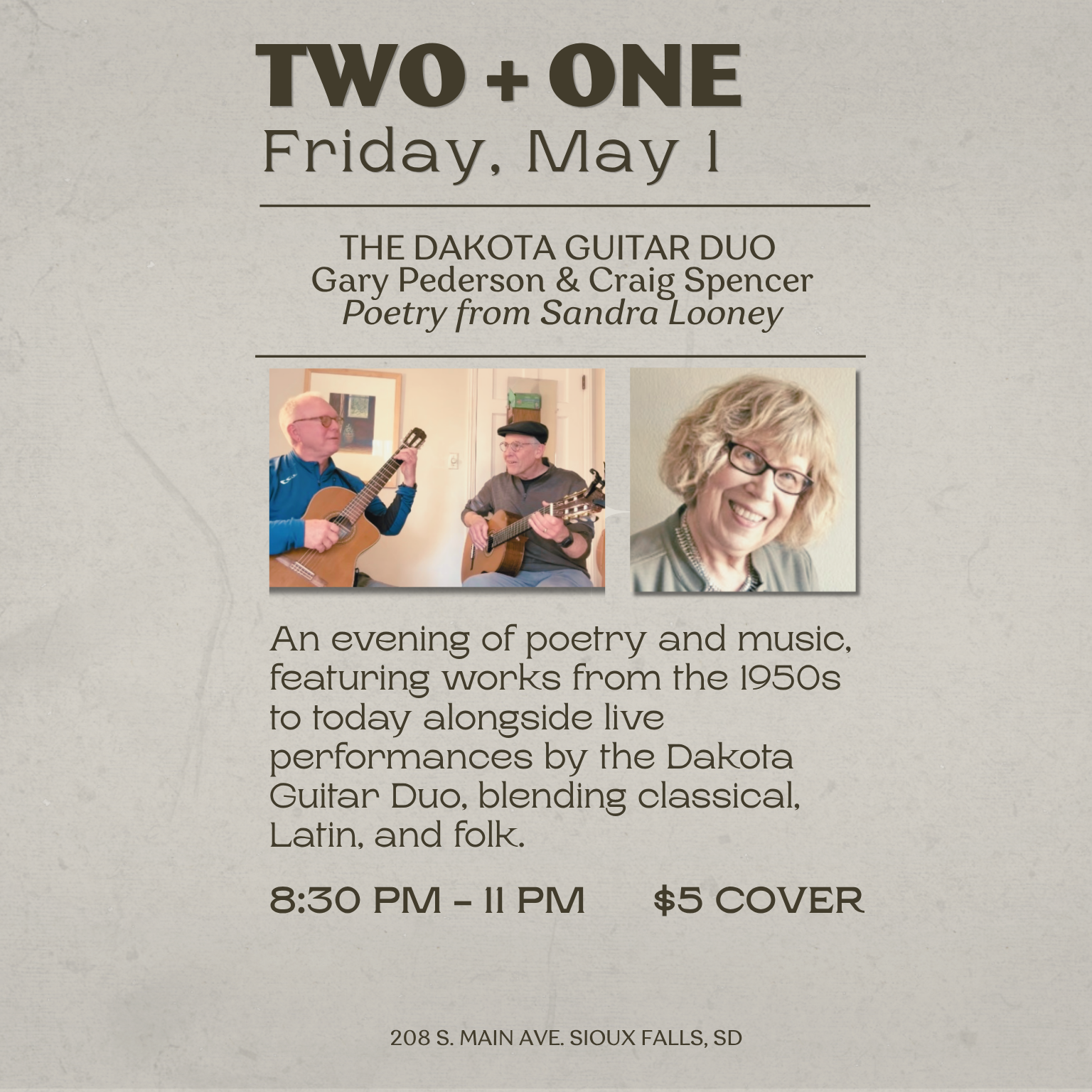 An evening of poetry and music, pairing the Dakota Guitar Duo with readings from Sandra Looney. Classical, Latin, and folk woven with poetry spanning decades, set in an intimate, listening-forward room.