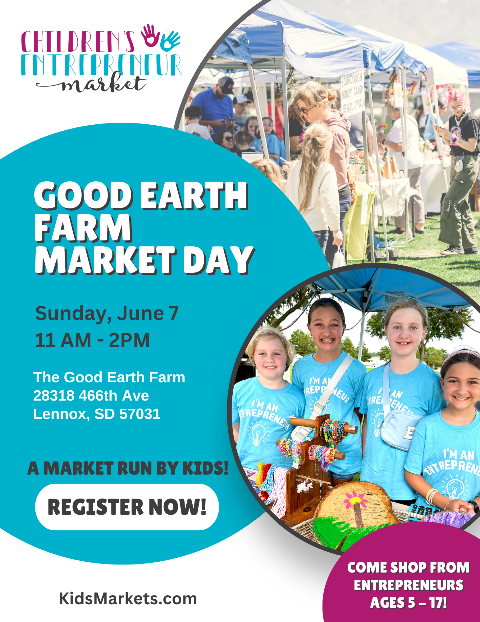 Good Earth Farm 28318 466th Ave Lennox, Lennox, SDKids Markets give young entrepreneurs the chance to run their own small business for a day. Kids sell something they’ve made, grown, or created while building confidence, creativity, and real-world skills in a fun, supportive community environment. Hosted on the beautiful grounds of Good Earth Farm.